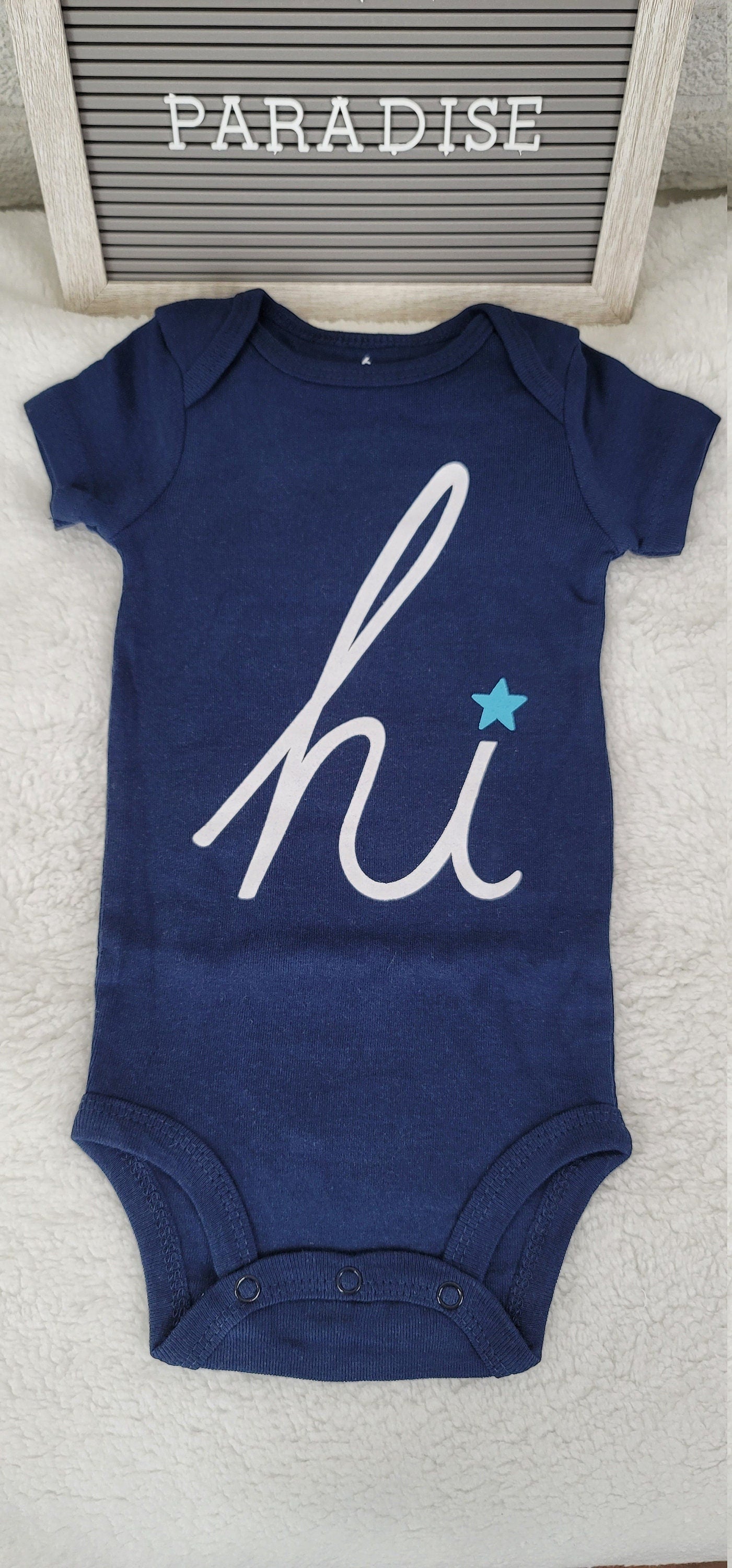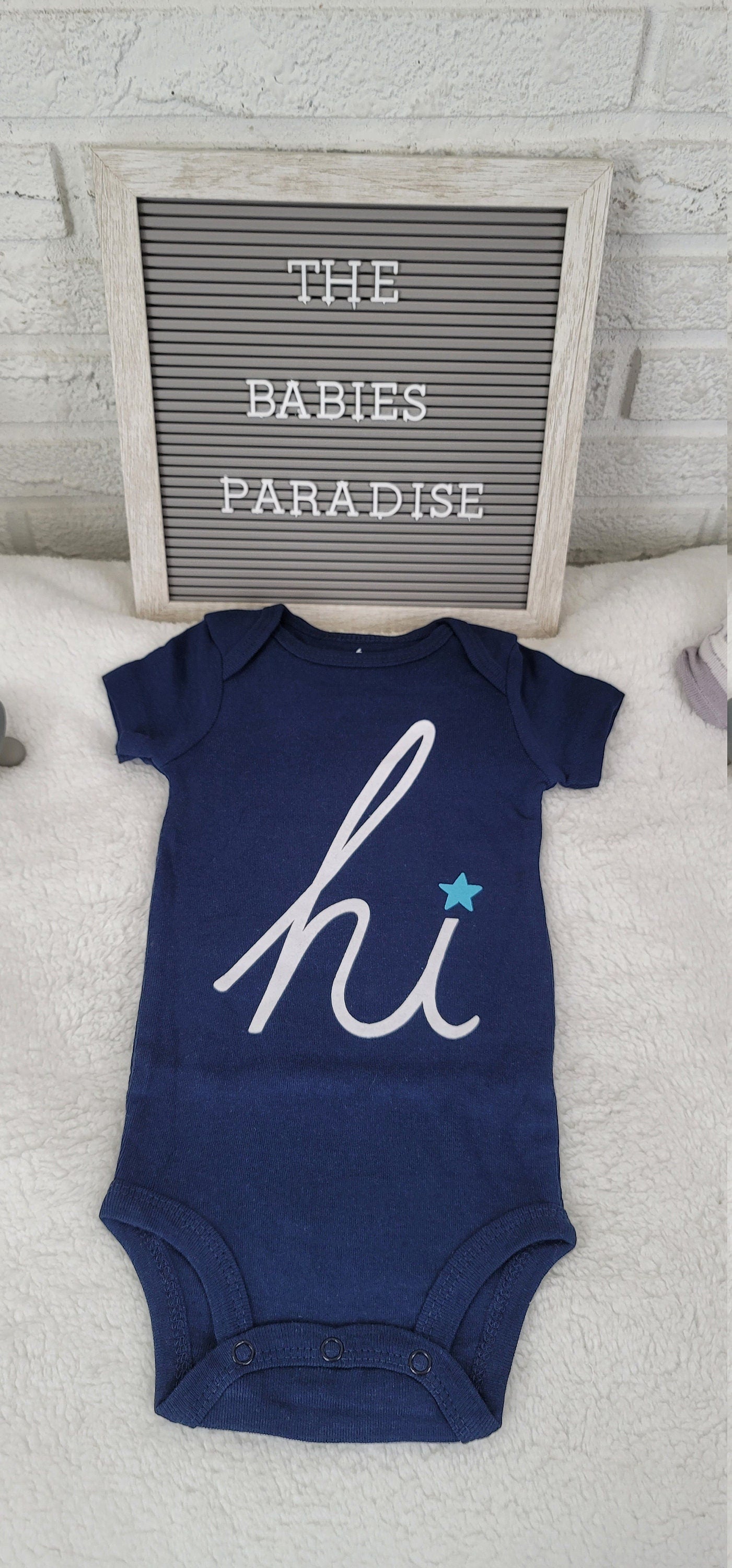 ✨ Crafted from 100% soft, breathable cotton, this Blue Baby Bodysuit is designed to keep your baby cozy and comfortable all day. With a cute, "Hi" design on the front, this onesie is not only stylish but also adds a warm and friendly touch to your baby’s look. Ideal for a 6-month-old baby boy, this onesie is tailored for a snug, gentle fit and easy movement. Whether it's for lounging, playtime, or as a special photo outfit, this baby bodysuit is both practical and adorable.