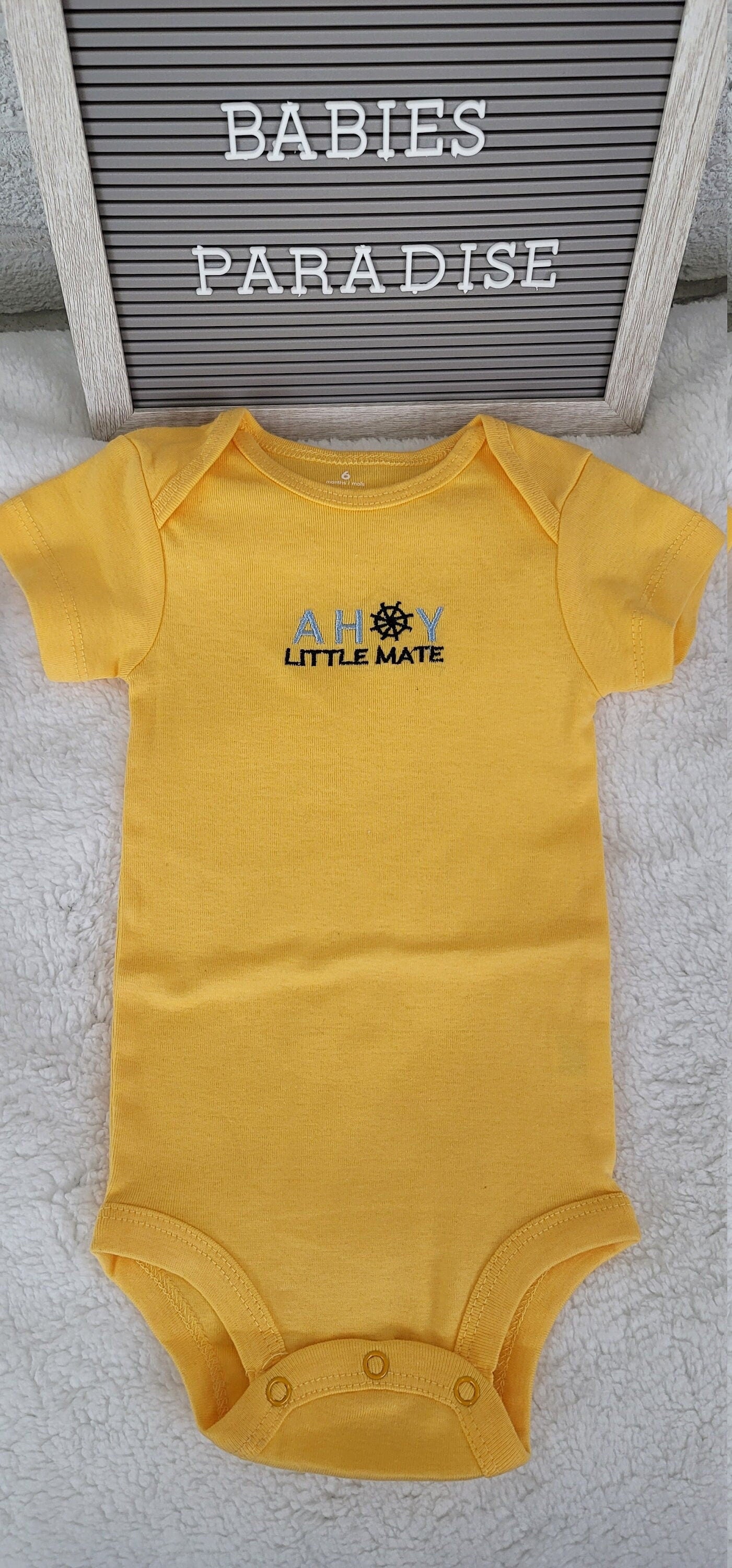 ✨ Crafted from soft, breathable 100% cotton, it keeps your baby comfortable all day long, making it ideal for playdates, outings, or snuggling up at home. The bright yellow color adds a playful pop, while the sailor-themed "Ahoy Little Mate" design is sure to bring smiles and compliments. This 6-month Onesie makes an excellent gift for new parents or baby showers, bringing a splash of fun and a hint of nautical charm to any little boy’s wardrobe.