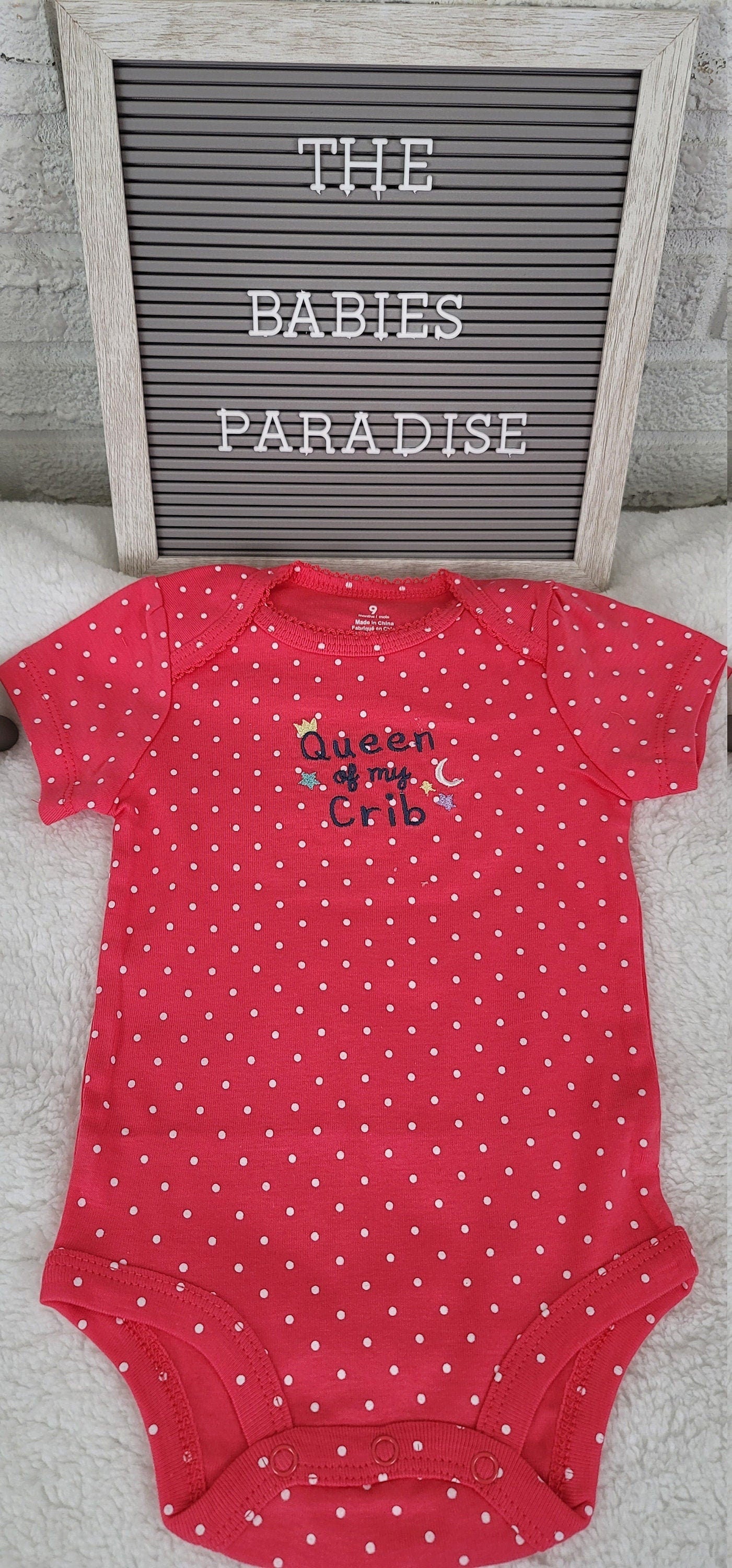 ⦿ Adorable pink onesie with white dots and “Queen of My Crib” design for baby showers, birthdays & more!