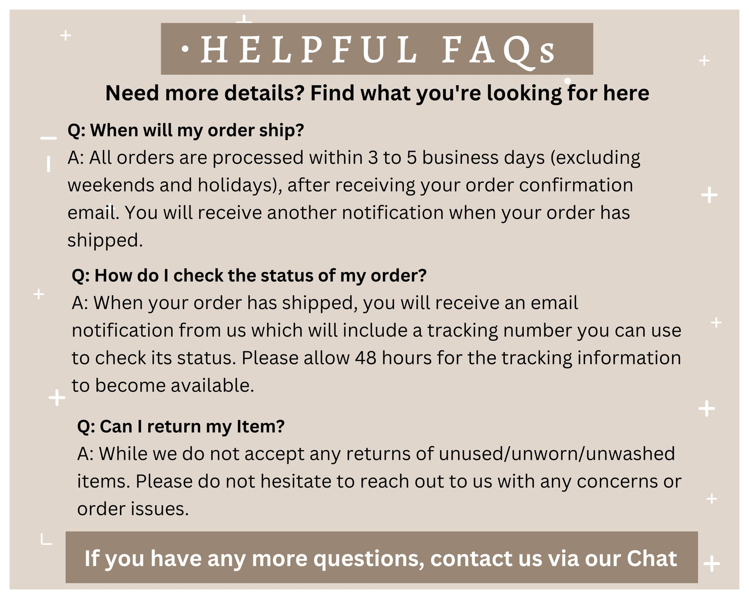 -If you are having trouble finding the answer to your question, please don't hesitate to send us a message. We do our best to reply immediately and will attempt to move mountains to accommodate your requests!